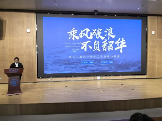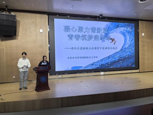 2023级水工三班班长贺淼、团支书孙鹤围绕“乘风破浪,不负韶华”主题进行汇报。水工三班的同学们始终保持积极向上的态度,班级凝聚力的提升让同学们在学习中相互支持,共同进步。