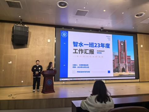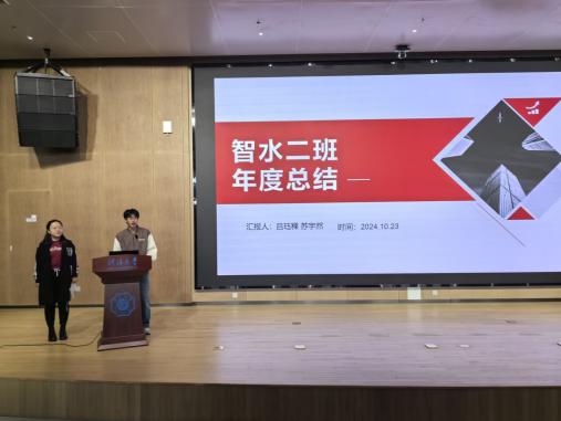 2023级智水一班班长王圣博、团支书薛云凤围绕“重温来路,忆成长;激昂青春,大可为”主题进行汇报。在过去的一学期中,智水二班所有同学团结一致,共同面对学习和生活中的挑战。
