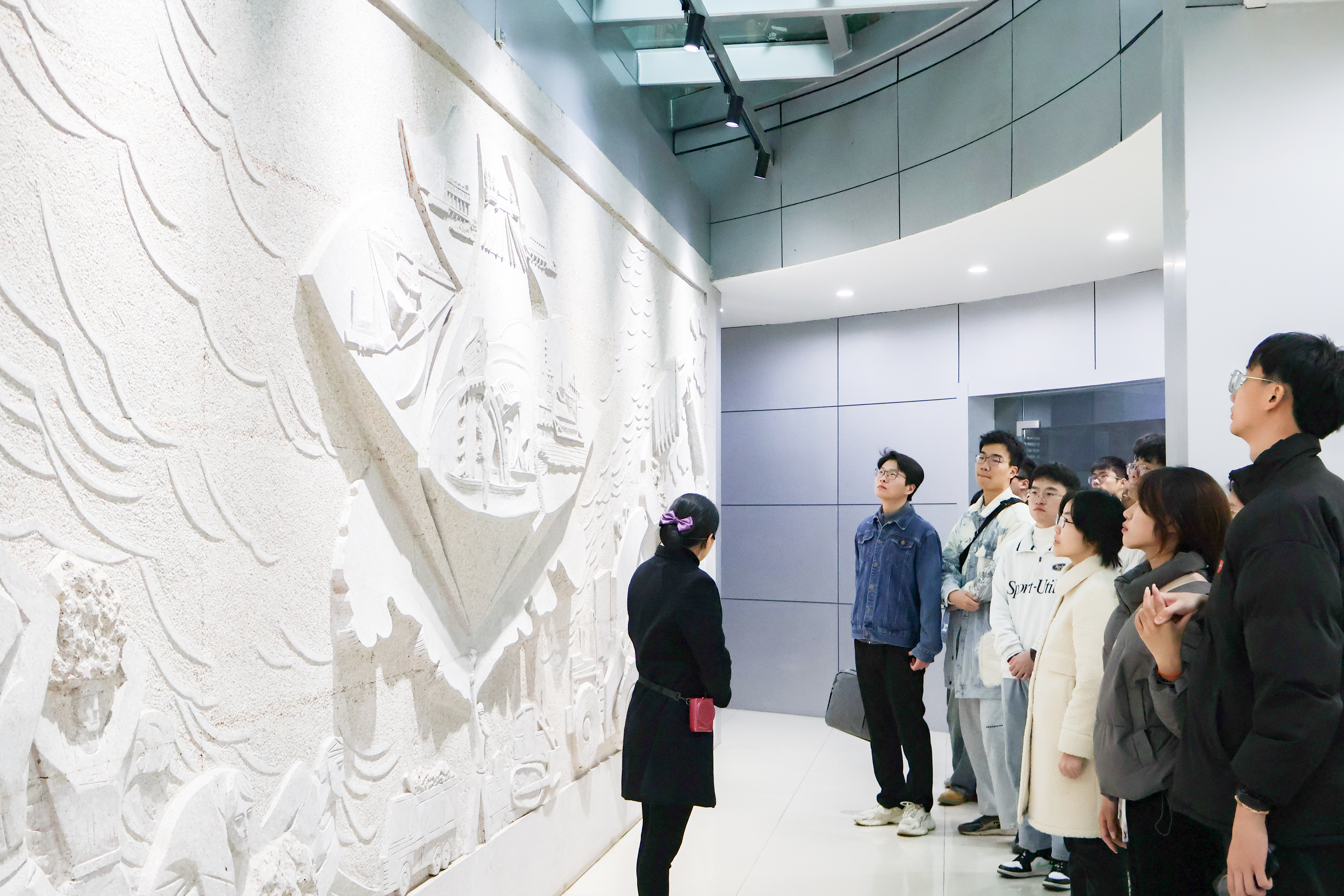 南京水利展示馆由序厅、南京水脉展区、历代治水展区、当代水利展区和水利展望展区五部分组成。河海学子紧跟讲解员的步伐,深入了解南京城市水系的变迁及其背后蕴含的历史文化价值,收获了关于南京水系演变的专业知识,见证了现代水利工程技术的发展与创新,对构建现代化水利新格局有了更加直观的认识。