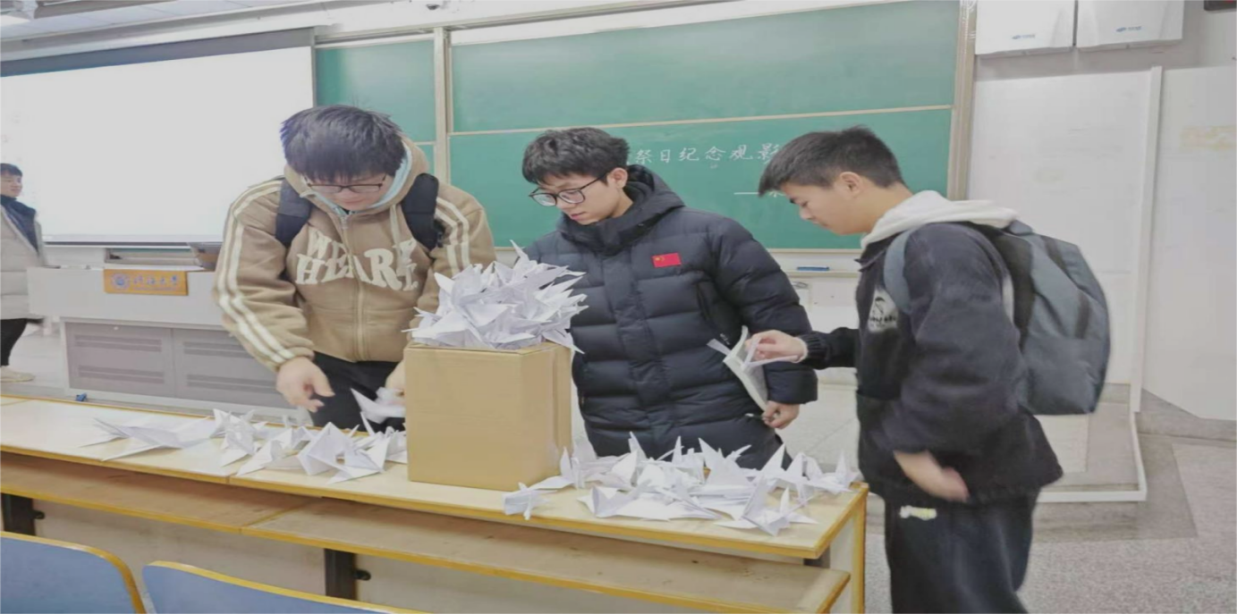 在肃穆、庄重的氛围中,进行了寓意于希望与和平的叠纸鹤活动。参加活动的同学们拿起白纸,怀着真切的哀思,折出纸鹤放入箱中。每一只纸鹤都承载着他们对遇难者的缅怀与对和平的祈愿,它们汇聚在一起,象征着同学们对惨痛历史的铭记以及对未来和平的不懈追求。