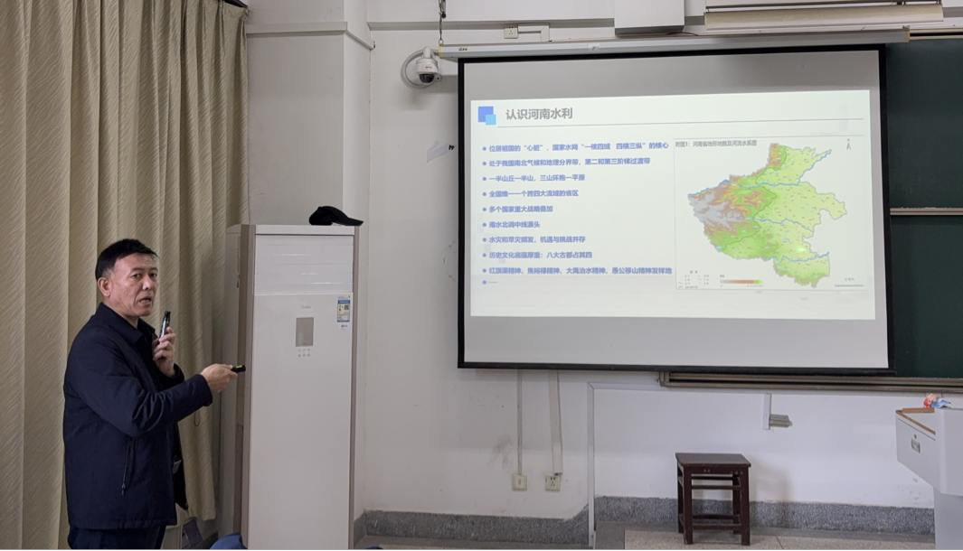 陆海以河南水利为例,详细介绍了河南的水精神文化、水科技文化,鼓励同学们传承大禹治水“三过家门而不入”的奉献精神和“以水为师”的科学治水精神。陆海从理念更新、概念更新、思路更新三个角度,为同学们指出水利行业未来发展方向。他提到,我们需重视生态环保的经济效益,量化水利工程背后的社会效益、生态效益。水利工程作为民生工程,涉及到社会的方方面面,在实际工作中不仅要从水利人的角度,更要从民众的角度思考问题。最后,他激励同学们勇于承担水利人的责任和使命,为以中国式现代化全面推进强国建设、民族复兴伟业提供有力的水安全保障。