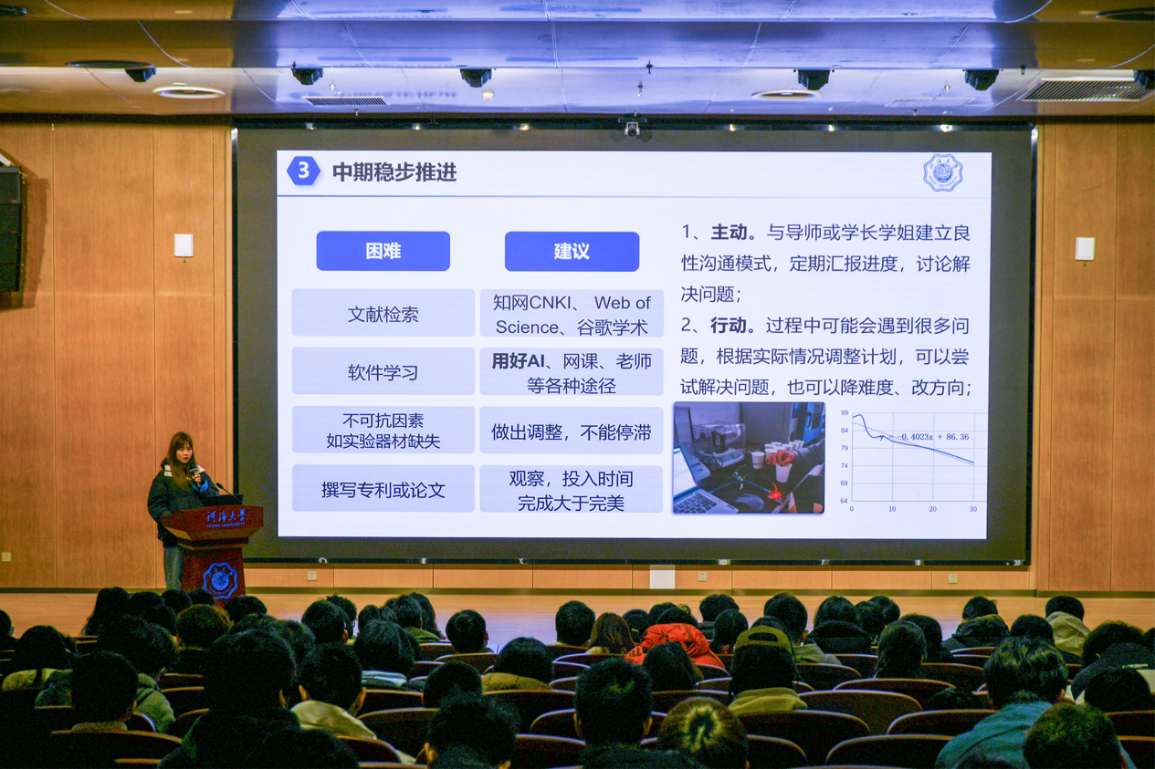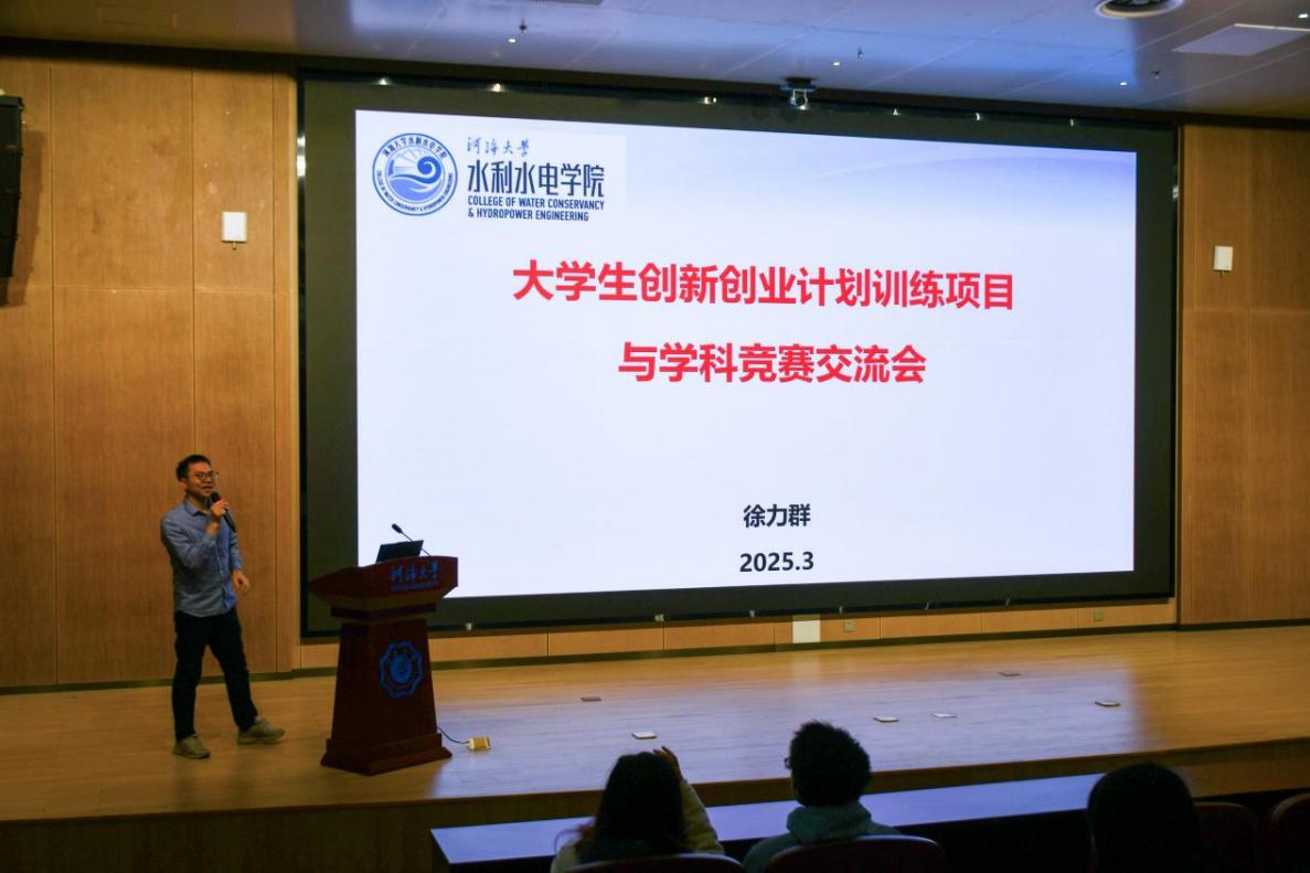 徐力群老师以“大学生创新创业计划训练项目与学科竞赛”为主题,系统讲解了比赛中项目申报流程、政策支持及组队事项等流程,分层分类提出具体建议。徐老师强调创新思维与学科交叉融合的重要性,详细分析了大创项目与“全国大学生水利创新大赛”“江苏省大学生水创意设计大赛”等赛事的联系与成果转化的可能性,鼓励学生依托校院两级培育体系,将比赛过程中所学得的专业知识转化为未来工作或学习路上的实践成果。徐老师深入浅出的讲解,不仅为学生厘清了创新创业项目在大学培养中的重要性,更提高了同学们参与大学生创新训练项目的热情。