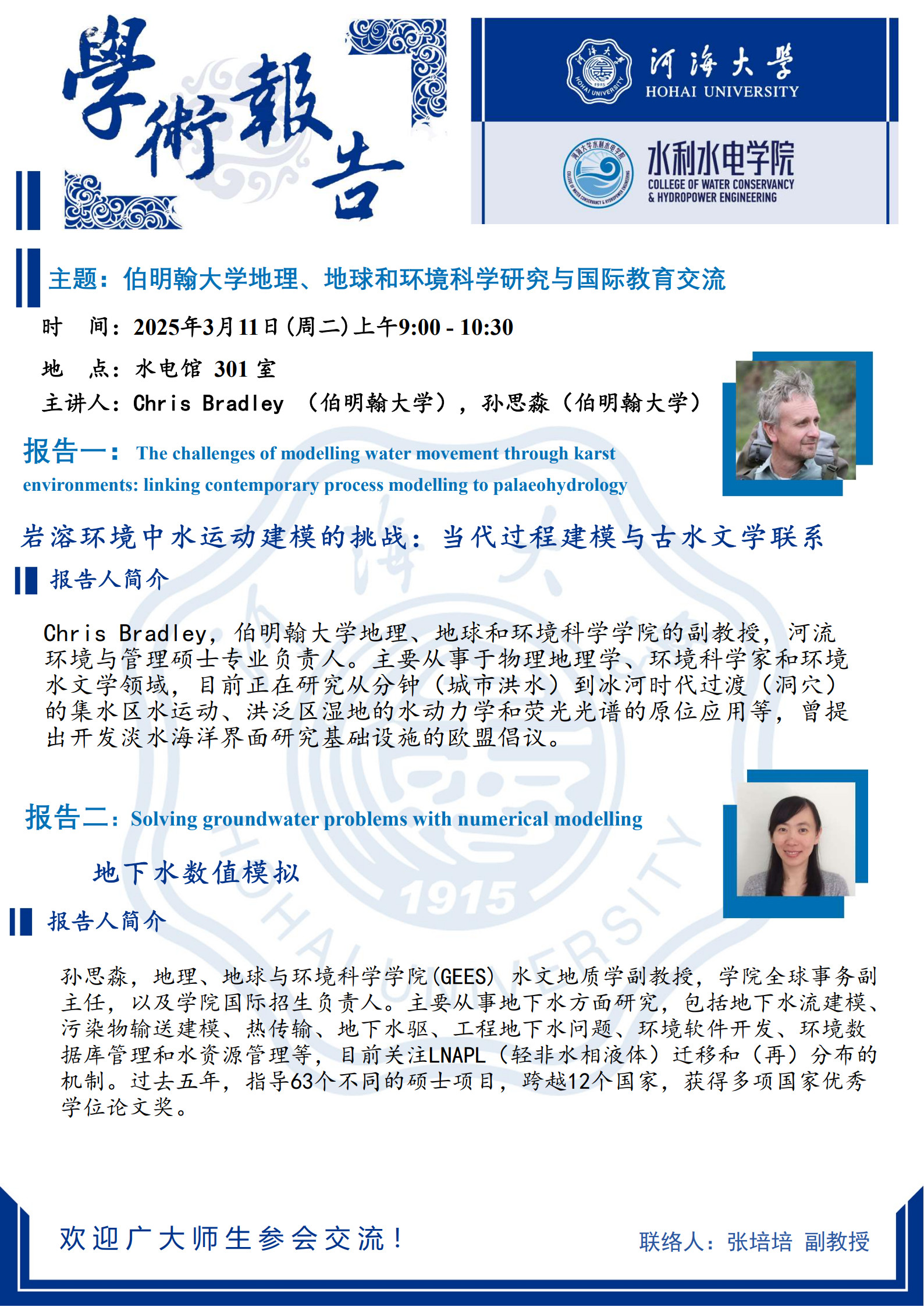 学术报告|The challenges of modelling water movement through karst environments: linking contemporary process modelling to palaeohydrology ( 岩溶环境中水运动建模的挑战:建立当代过程建模与古水文学的联系)
