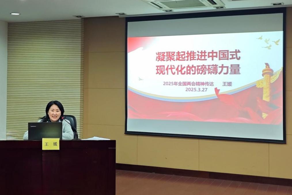 王媛院长以“凝聚起推进中国式现代化的磅礴力量”为主题,结合自身3月4日—10日前往北京人民大会堂参加全国两会的经历,向在场师生详细解读了2025年全国两会的基本情况、主要特点、核心内容与重点议题,分享自己的履职体会。她谈到,今年全国两会重点聚焦高质量发展、科技创新、生态文明建设等方面,深刻把握中国式现代化对教育、科技、人才的需求,其中江苏作为经济大省,要勇挑大梁,在发展新质生产力、科技创新与产业创新融合、深化改革开放、促进共同富裕等方面发挥示范带头作用。