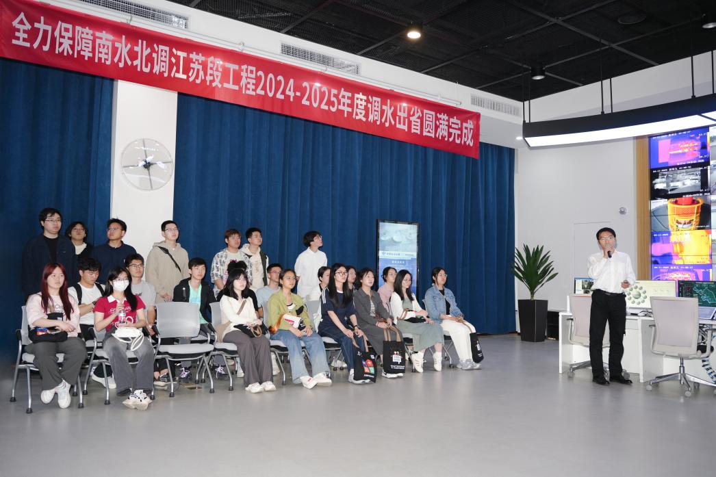 师生们前往南水北调东线江苏水源有限责任公司,参观江苏水情教育基地。基地内,通过《东源流长 润泽四方》宣传片及沙盘模型,师生们直观了解了南水北调东线工程的宏伟规划与建设成就。该工程自2005年启动以来,历经多年攻坚克难,已形成“T”字型供水大动脉,串联洪泽湖、骆马湖等四大调蓄湖泊,实现“水往高处流”的工程奇迹。南水北调东线江苏水源有限责任公司的工作人员以“南水北调工程现状及发展趋势”为题,详细介绍了工程规划、建设历程及未来展望,并通过现场互动解答了学生们关于工程效益、技术突破等方面的疑问。