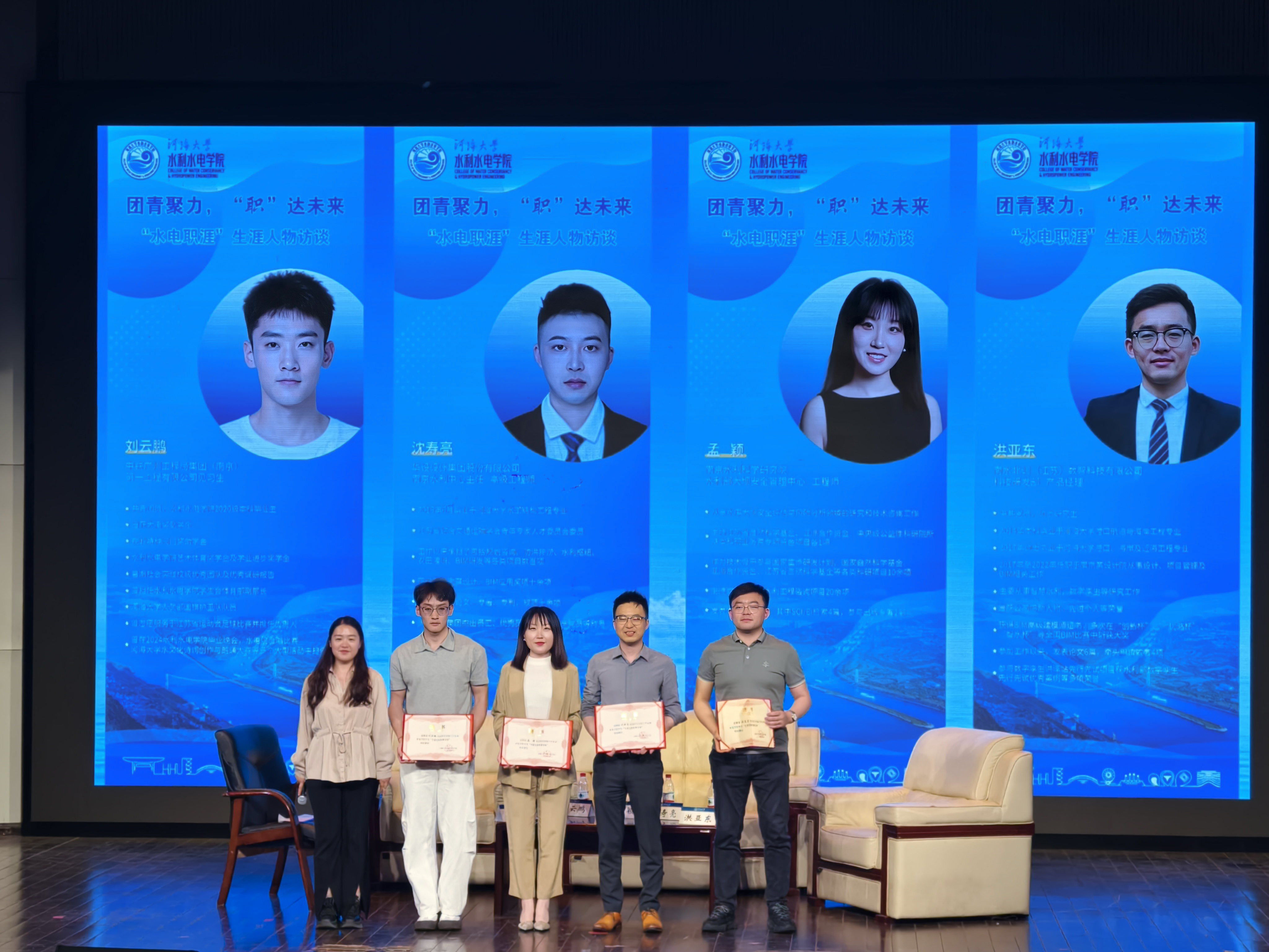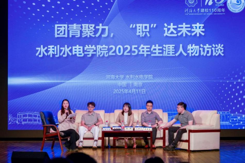 为助力学生明晰职业方向、深化行业认知,污漫 于2025年4月11日晚在博学楼报告厅举办“团青聚力,‘职’达未来”生涯人物访谈活动。活动特邀华设设计集团南京水利中心主任沈寿亮、南京水利科学研究院工程师孟颖、南水北调(江苏)数智科技有限公司产品经理洪亚东、中铁广州工程局见习生刘云鹏四位校友,围绕职业规划、行业趋势与成长路径展开深度对话。四位嘉宾分别来自设计、科研、科技企业与工程一线,其多元背景为在场学生提供了多维度的行业视角。2024级全体本科生参加,访谈由2024级辅导员笪步源主持。