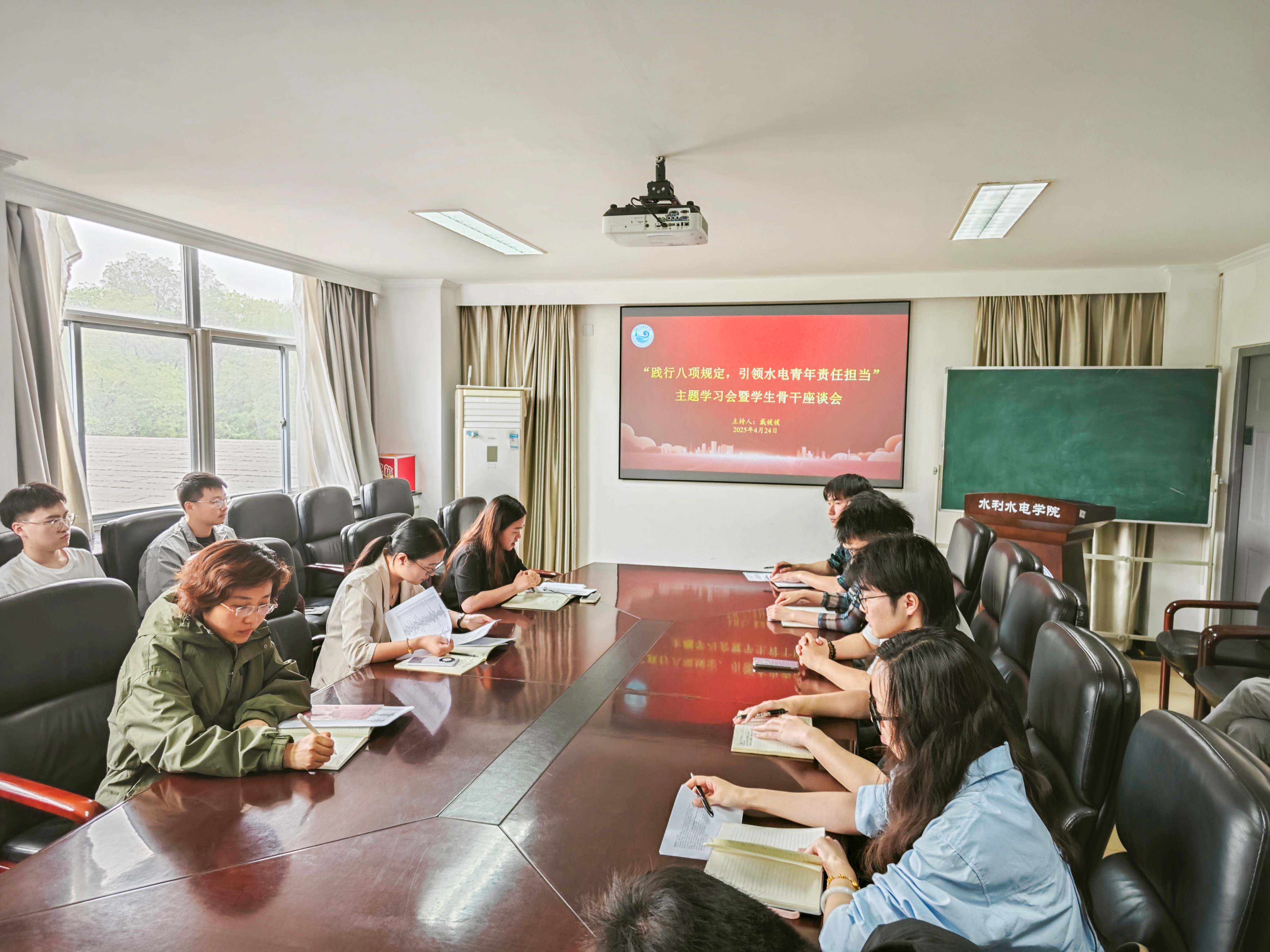 为进一步加强作风建设、推动党风廉政教育入脑入心,增强青年学生骨干的责任意识与服务意识,4月24日,污漫 于水电馆329会议室召开“践行八项规定,引领水电青年责任担当”主题学习会暨学生骨干座谈会。学院党委副书记戴媛媛、团委书记笪步源、研究生辅导员赵志涵及学院研究生会主要学生骨干参与此次会议。