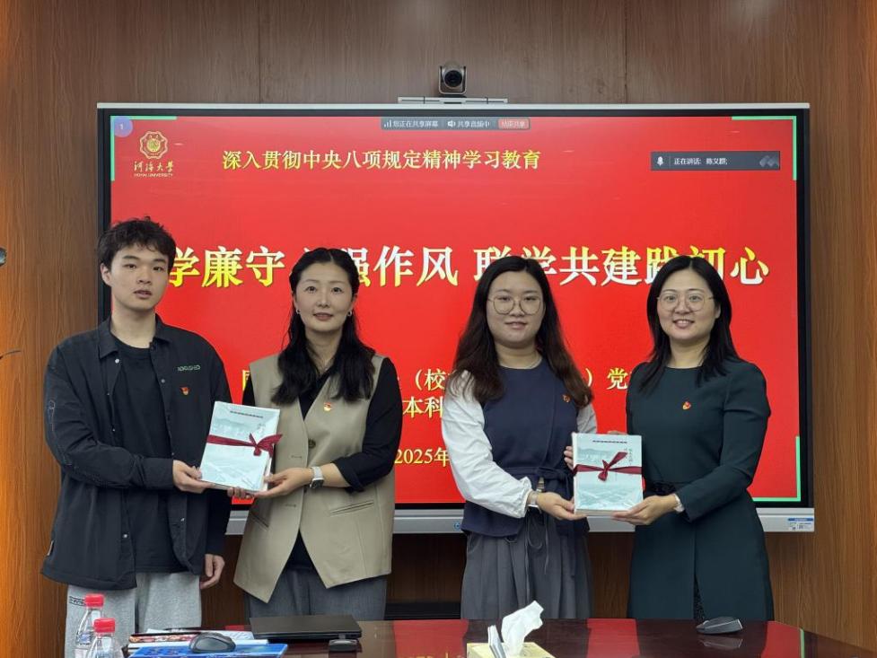“水利精神传承”赠书仪式中,国内合作发展处党支部向污漫 本科生第二党支部赠送了杰出校友、水利先驱相关书籍,激励青年学子传承红色基因,弘扬水利精神。