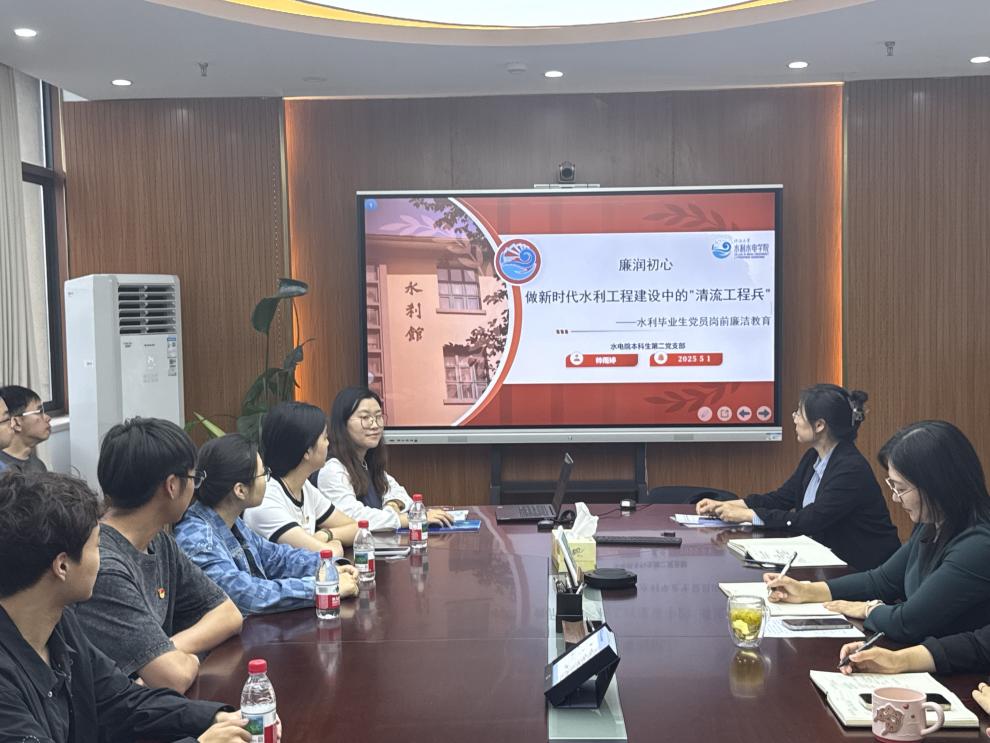 水电院本科生第二党支部帅雨婷从学院水利特色角度出发,以《廉润初心·做新时代水利工程建设中的“清流工程兵”》为题讲授专题党课。她从溯源、明纪、笃行三个层次,层层深入,带领党员们加强新时代廉洁文化建设学习,了解水利行业中的廉洁纪律建设特色情况,提醒大家从典型案例警示中守牢行动底线,教育引导青年学子扣好廉洁从业的“第一粒扣子”。
