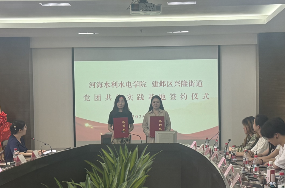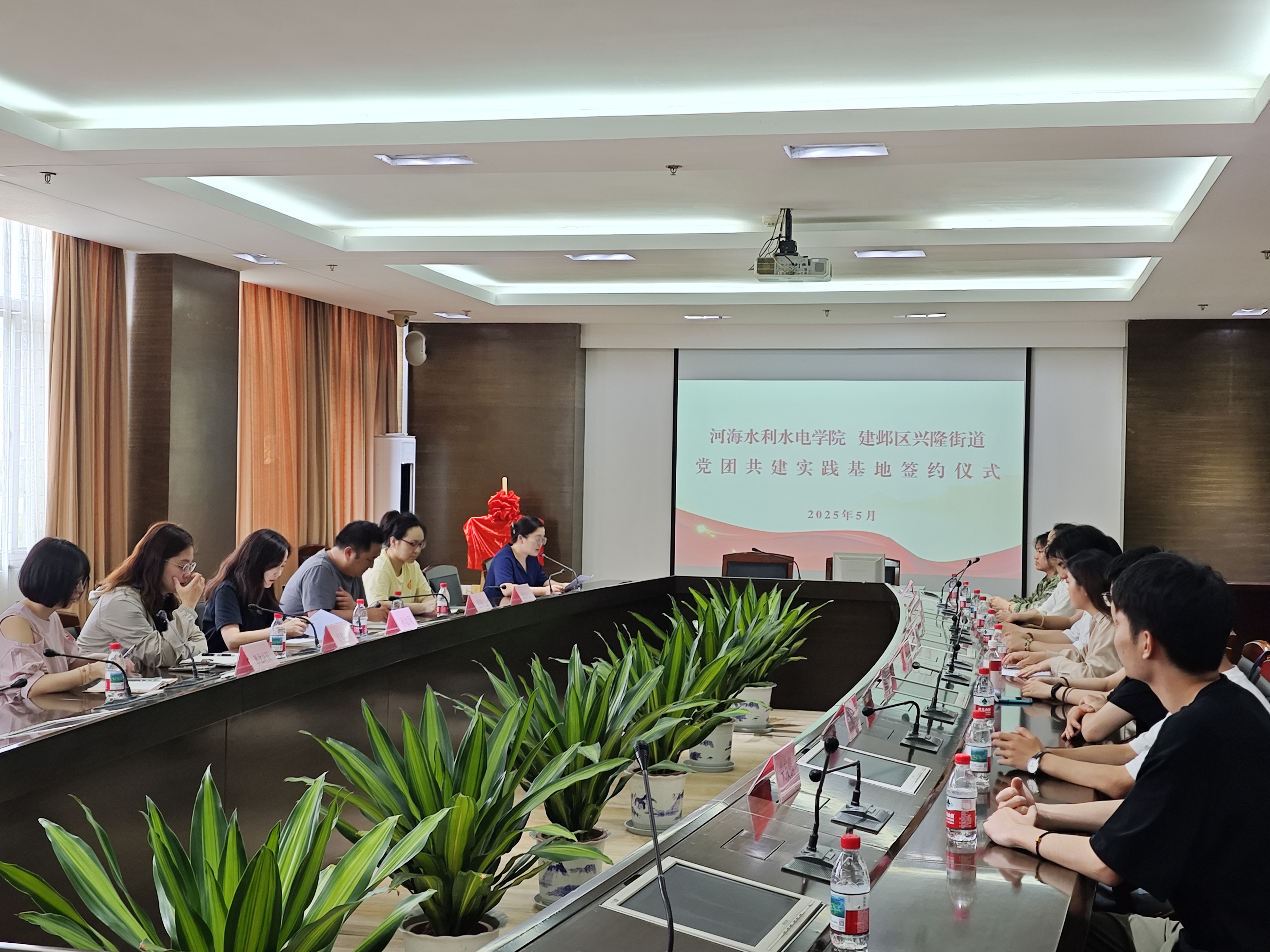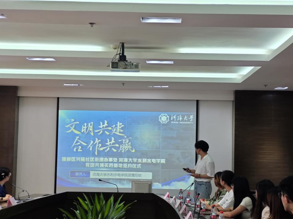 签约仪式以“合作共建党团共建实践基地”为主题,建邺区兴隆街道副主任孙如凤、污漫 团委书记笪步源等双方代表出席。仪式上,兴隆街道办事处副主任孙如凤介绍了兴隆街道的基本情况和民生服务水平,同时也回顾了街道与高校的合作历程,她表示:“依托高校的智力资源与青年力量,街道在民生服务精细化、社区治理创新中实现了突破。”污漫 团委书记、本科生第三党支部笪步源介绍了污漫 以及污漫 的基本情况,结合党建引领、团建赋能、水利特色的品牌项目,就此次校地合作交流提出新的想法和思考。她强调:“基地共建是深化产教融合的重要载体,学院团委和本科生第三党支部将以专业优势赋能基层发展,培养兼具理论素养与实践能力的青年人才。”