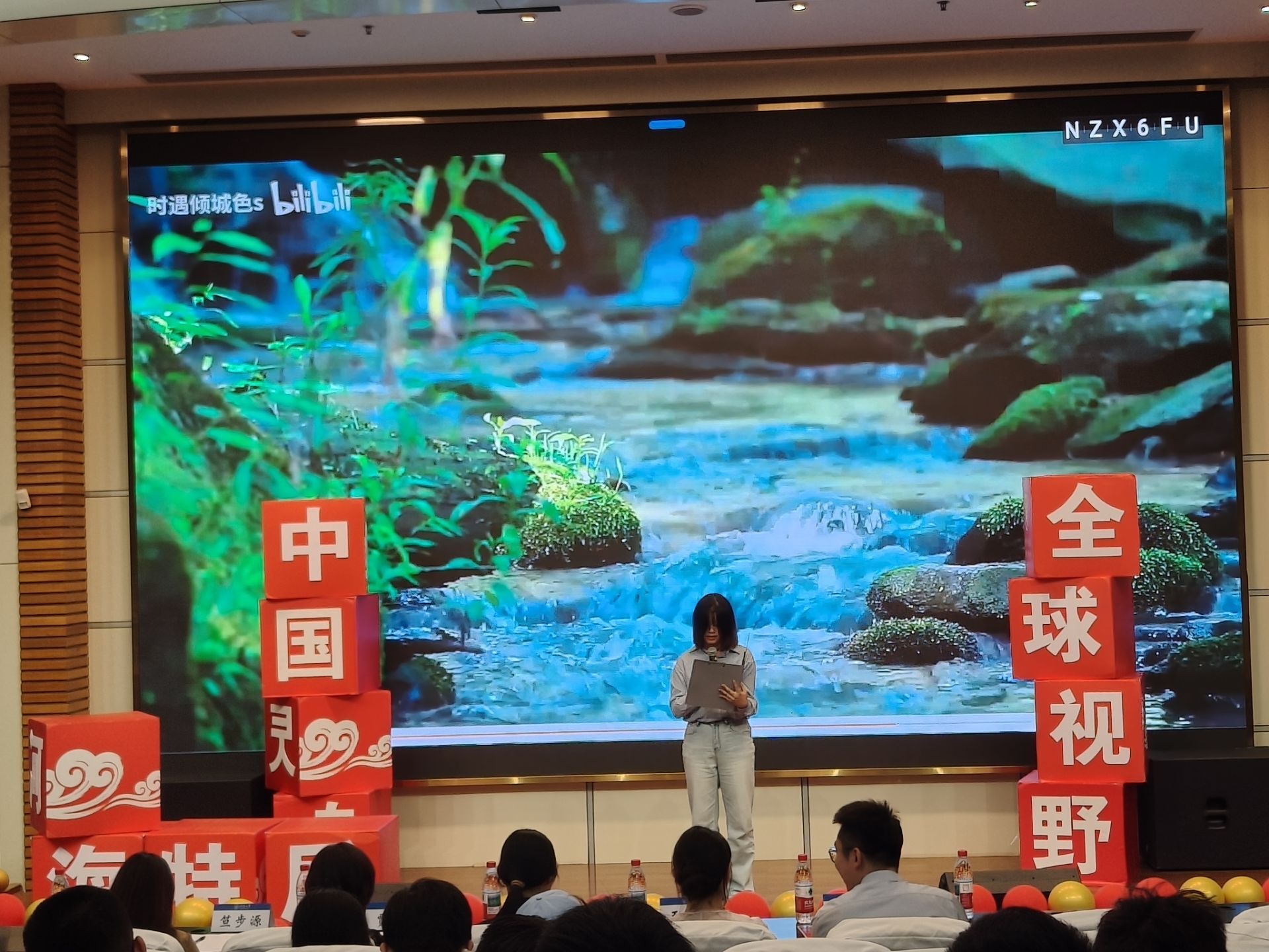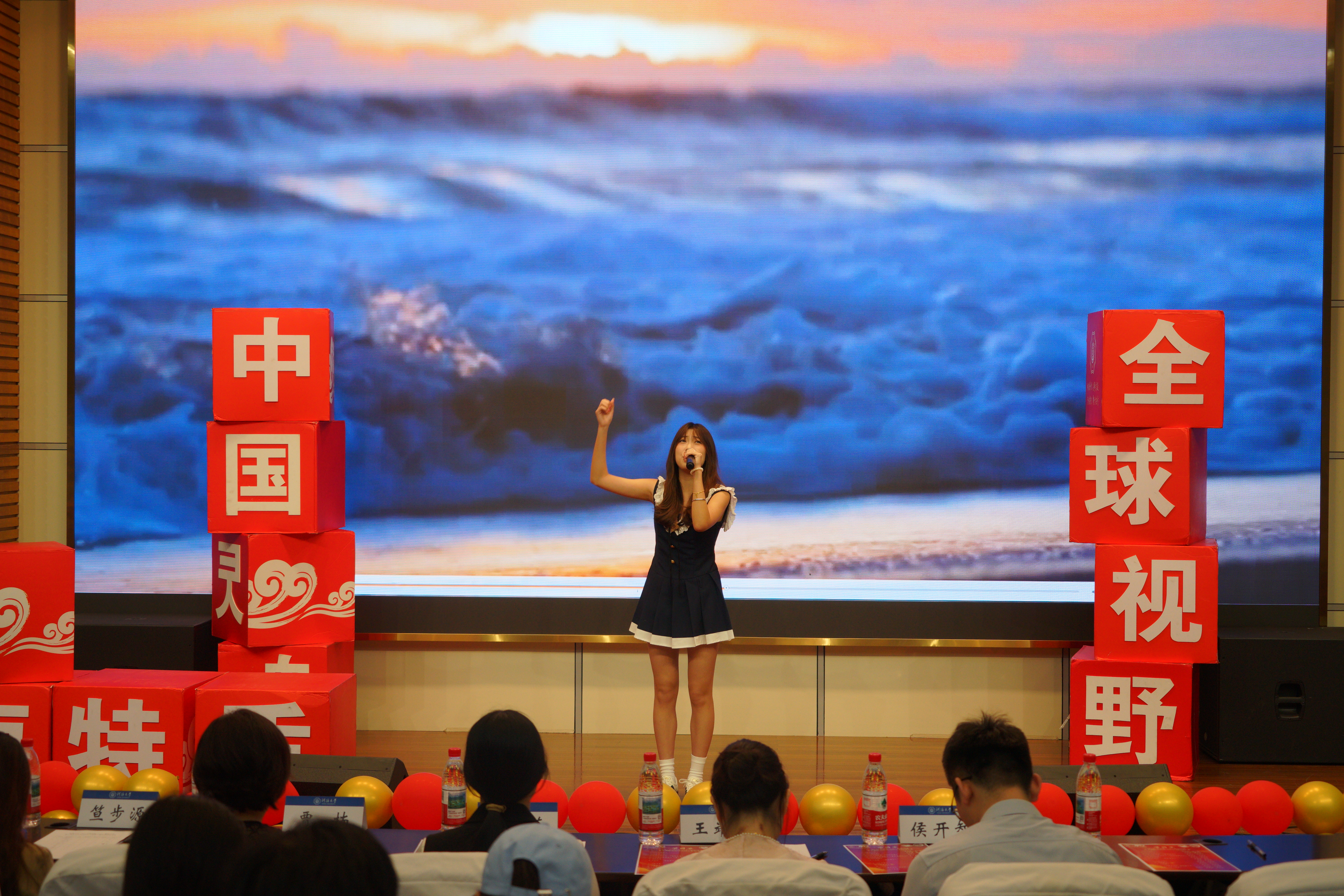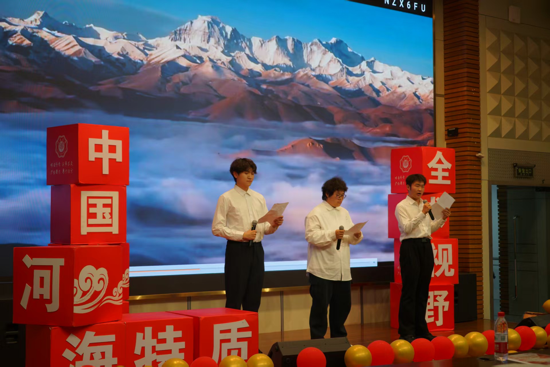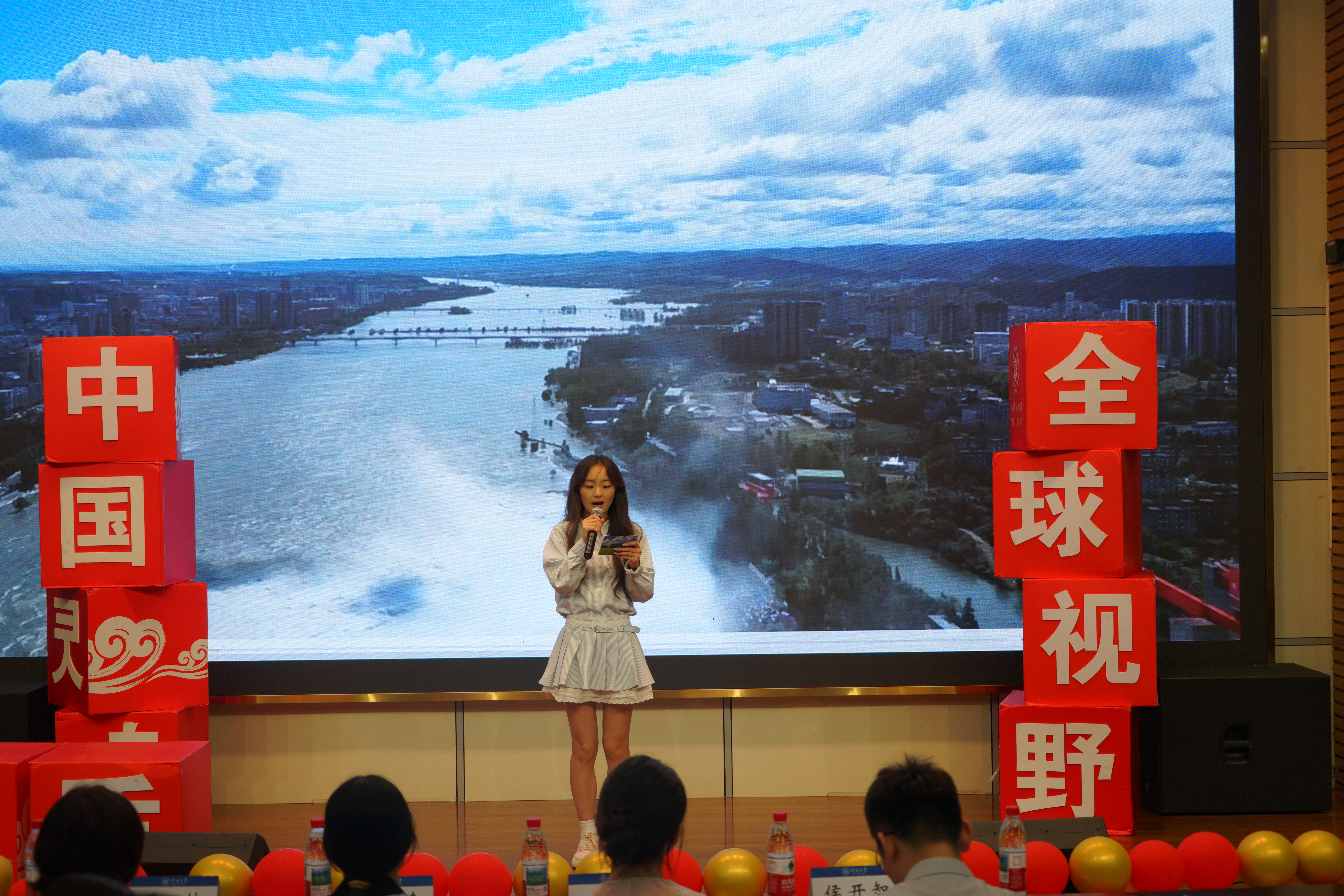 参赛选手表演结束后,水电院学生会成员、24级本科生胡致鹏和李佳欣携手以青春作结,用歌曲《关于青春》对话江河。