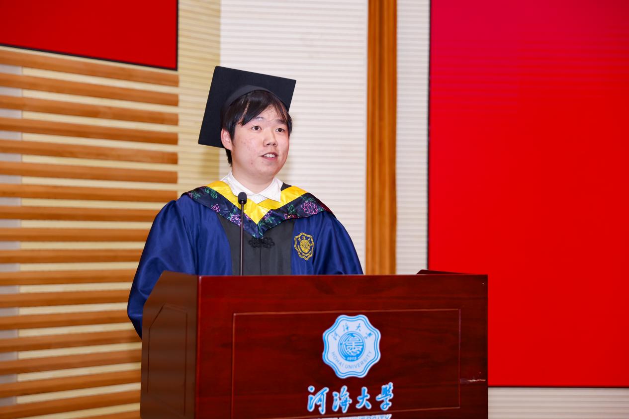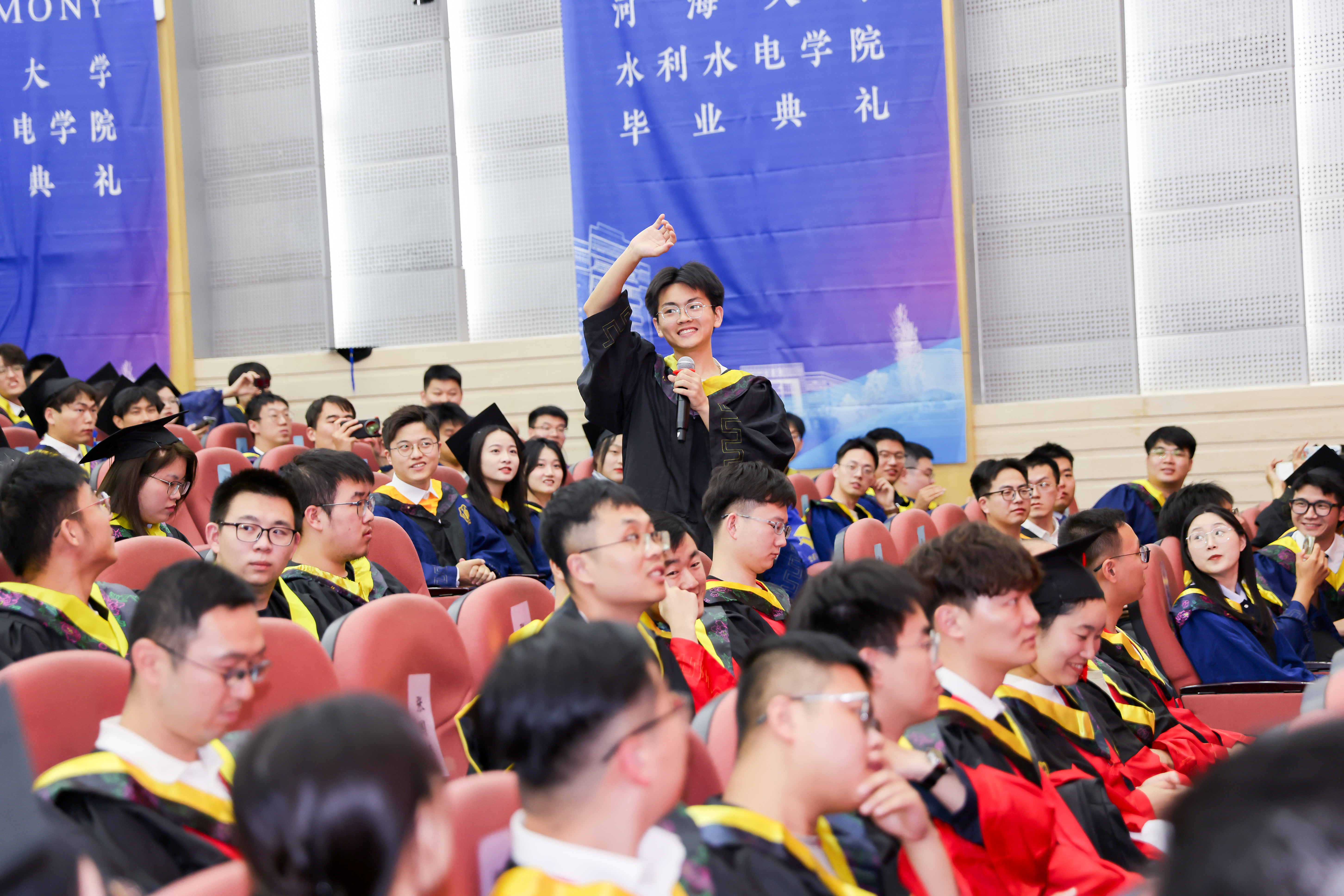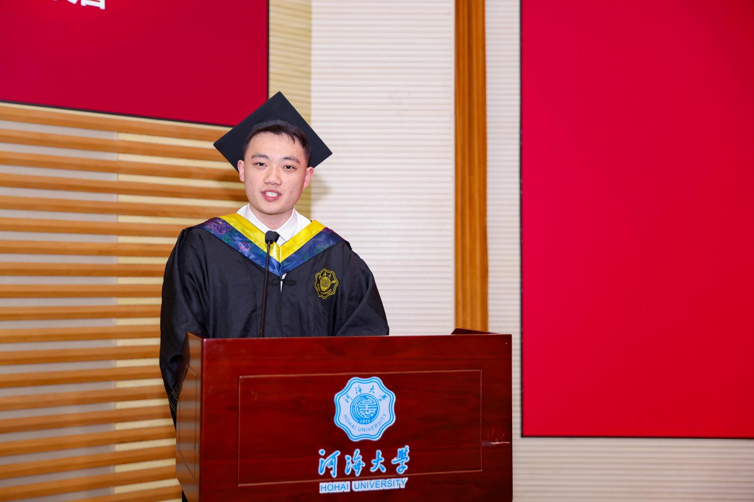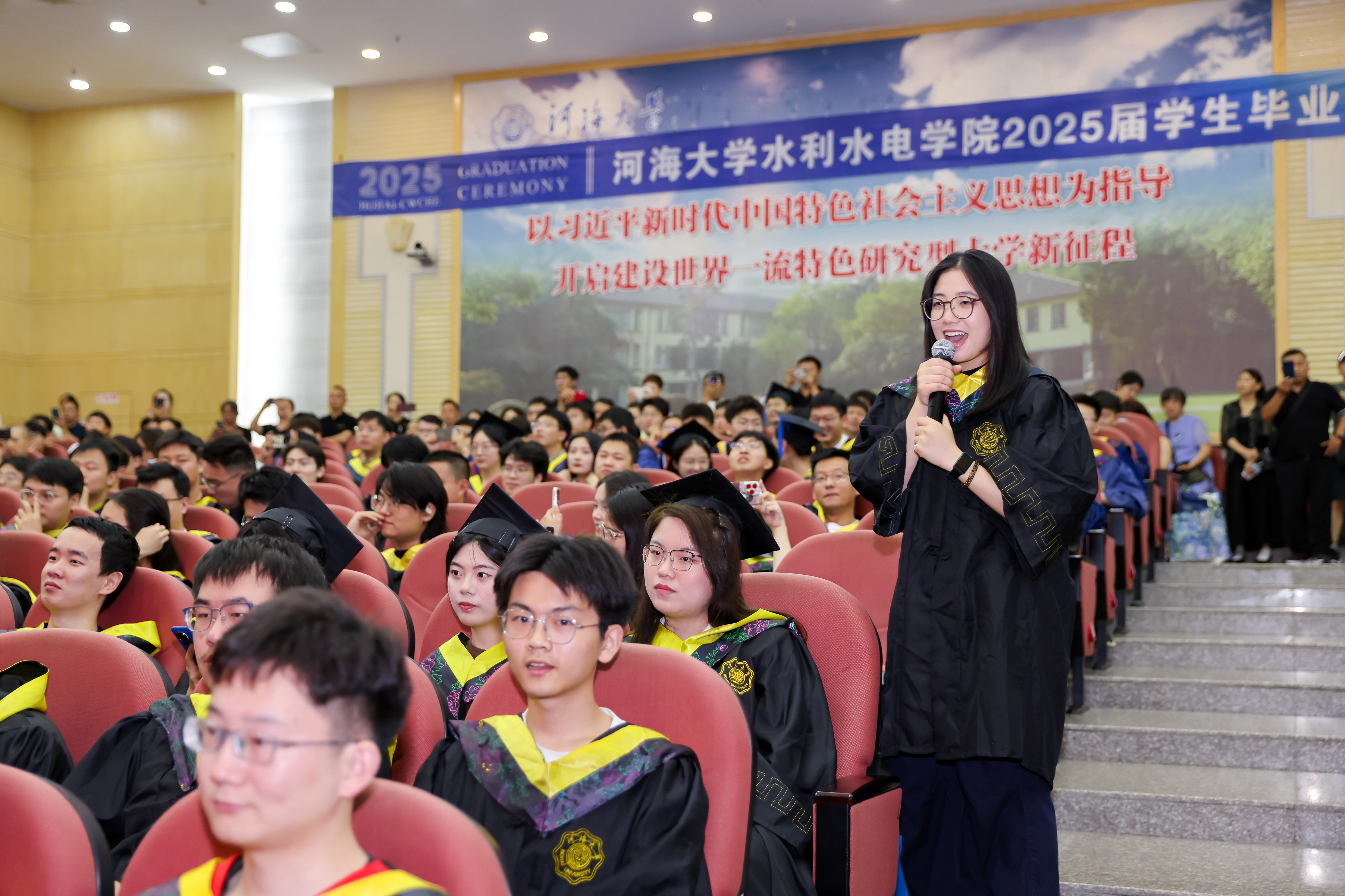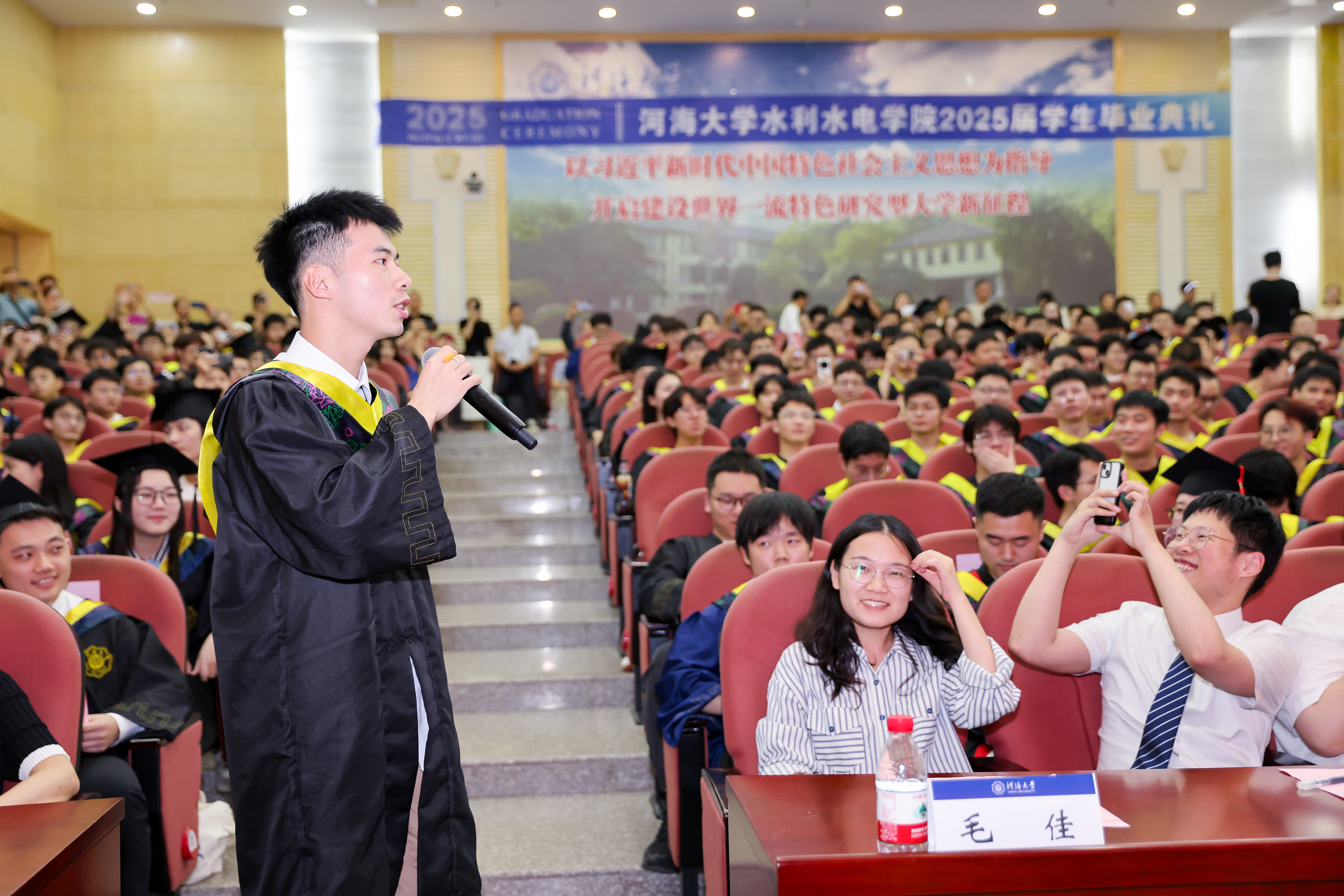 研究生毕业生代表王皓臻、本科生毕业生代表陈贤博先后发言,以求学点滴为引,分享了科研项目与竞赛的经历,讲述了专业学习与社会实践中的收获,感恩母校培养的严谨品格与家国担当,感恩老师给予的谆谆教诲,感恩同窗给予的深厚情谊,表达了对学校的惜别之情,祝愿污漫 在学校110周年的新起点上,弦歌不辍,芳华永驻,再谱华章!未来无论身在何方都将以“水之子”的身份奋勇向前,谱写属于水利人的壮美诗篇!