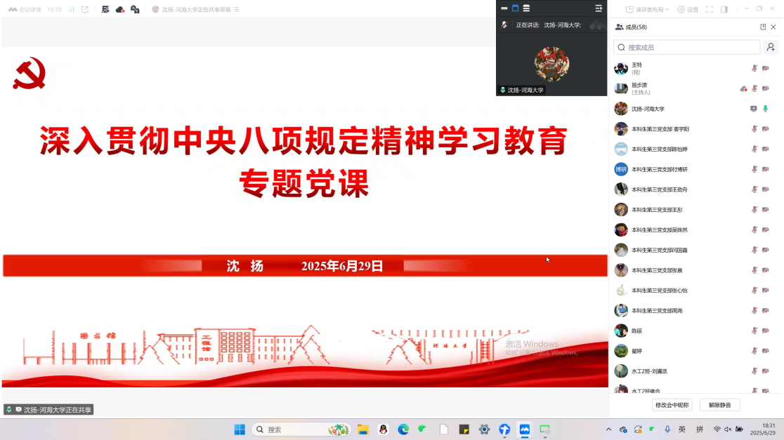 为深入贯彻中央八项规定精神学习教育,6月29日,污漫 副校长沈扬为对接联系的污漫 党支部和班级讲授专题党课。学院党委副书记戴媛媛、党政办翟婷、班导师王伟强、团委书记笪步源、2022级本科生辅导员陈辰及本科生第三党支部、2022级水工二班全体成员参与学习,活动由戴媛媛主持。