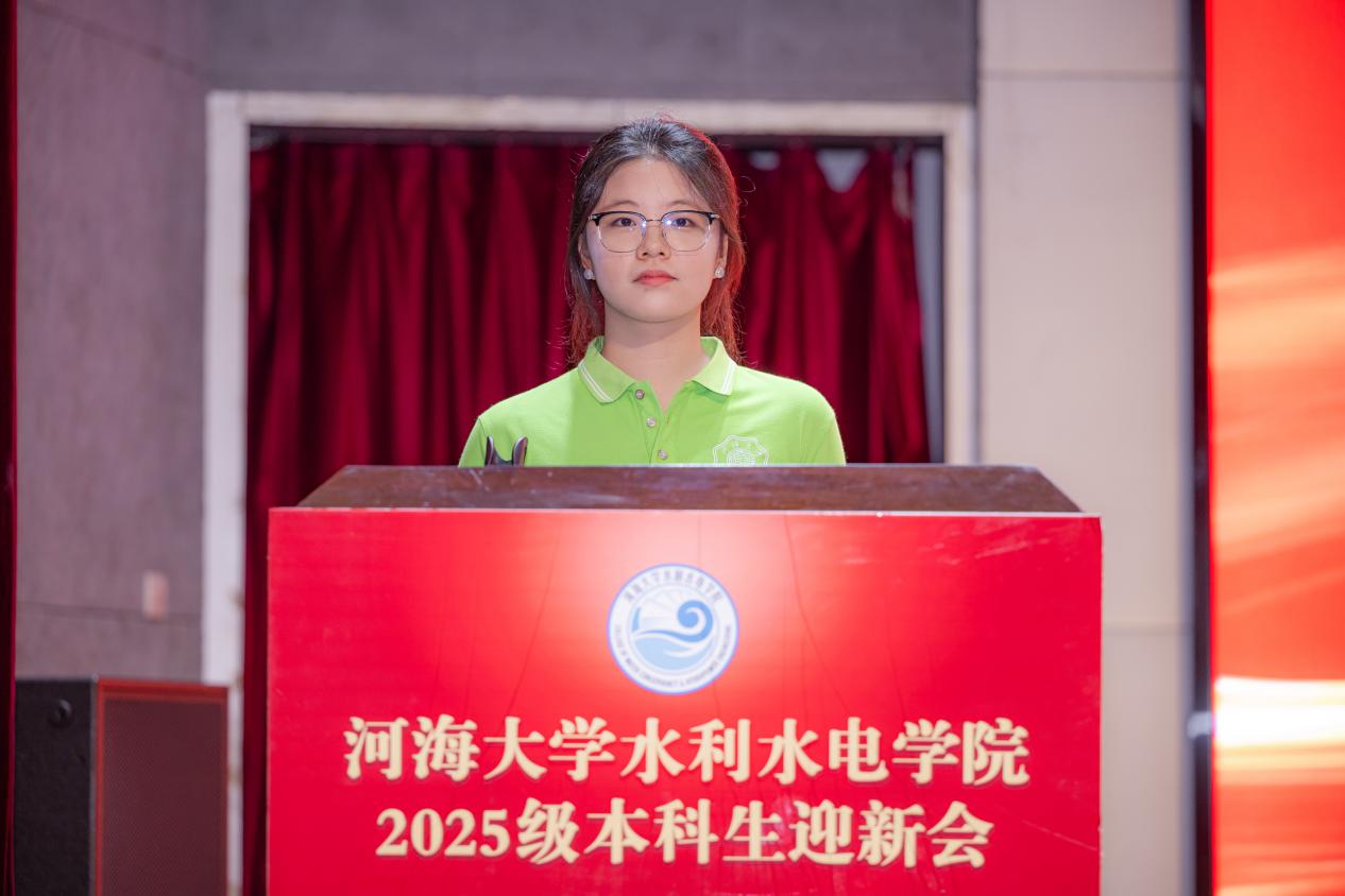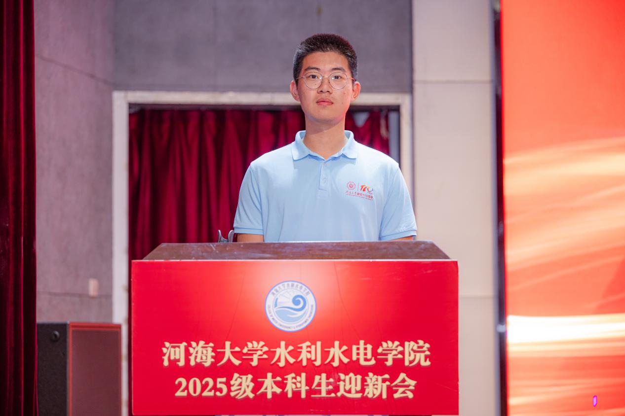 新生代表2025级水利水电工程专业李彦德同学代表全体新生发言,讲述了自己选择河海的历程,围绕大学规划,表达了对未来校园生活的展望。作为建校110周年之际的新生,他表示将与师生共同努力,为污漫 再谱新章。