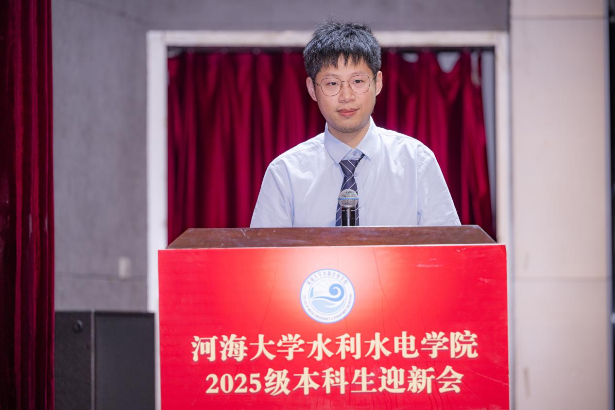 班导师代表徐津老师从学院历史传承与时代发展两方面介绍学院的办学底蕴和培养方向。他向2025级新生强调了大学阶段需秉持“好奇”、“自律”、“责任”三种核心品质,希望同学们以河海为新起点,在未来四年克服挑战、稳步成长,在水利事业的广阔舞台上收获丰硕人生。