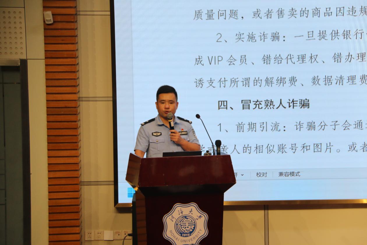为切实筑牢校园安全防线,9月20日上午,污漫 邀请江宁开发区派出所曹警官在江宁会议中心二楼,为2025级新生举办了一场反诈专题讲座,由2025级本科生辅导员侯开智主持,352名2025级全体新生参加。