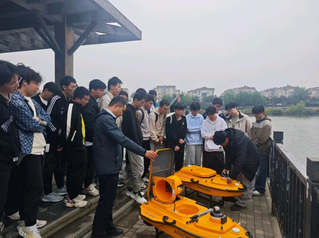 同学们在企业专业技术人员的带领下,近距离参观并了解了多波束测深系统、无人测量船、高精度GNSS接收机等一批先进的水利智能装备。技术人员深入浅出地讲解了这些设备的运作原理、技术优势以及在现代水利水文勘测、水资源管理中的具体应用。