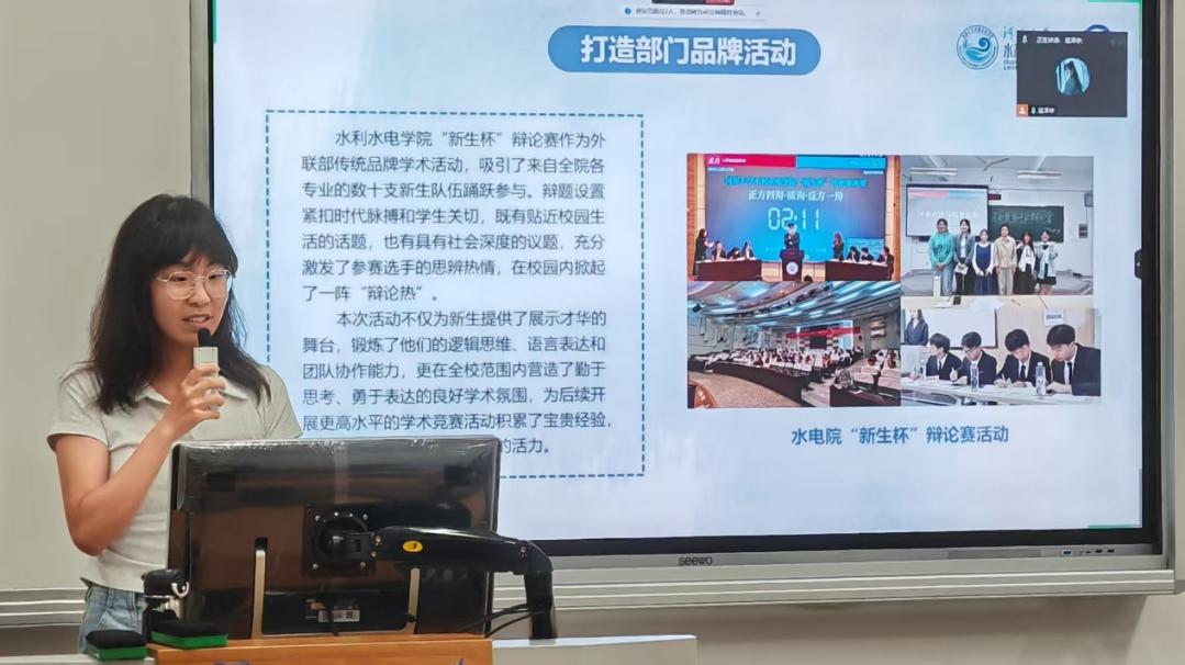 外联部郭慧心同学介绍了外联部策划举办的“新生杯”辩论赛、新干事见面会等品牌活动,既为同学们搭建展示风采的舞台,也为学生会的成员们提供联络感情的纽带,充分展现了外联部作为学生会的沟通桥梁的重要作用。