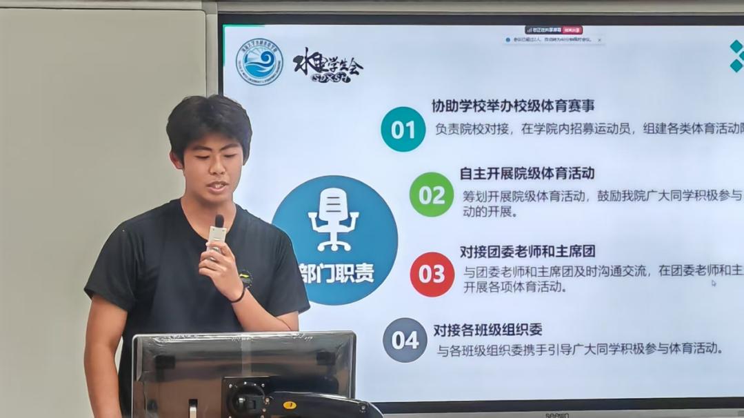 体育部闫金铭同学在汇报中详细阐述了部门本学年的工作重点与成效。体育部不仅为学院参与院校系列赛事提供坚实的组织、后勤保障,也为同学们举办了游泳、力量举等多项体育活动,推动学院体育文化的建设与推广。