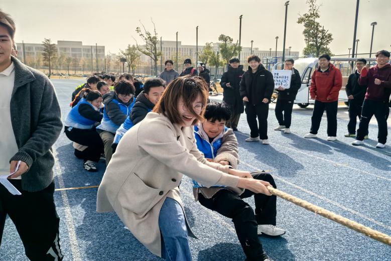 第一项活动拔河比赛由学院副书记带队,师生热情参与,呐喊声、脚步声、绳索拉动的摩擦声汇成赛场最热烈的节奏。选手们咬紧牙关、全力以赴,力量对抗令人心潮澎湃。绳索在两队之间寸寸移动,选手们重心后压、紧握长绳,这不仅是对力量的考验,更是对团队协作与坚韧意志的极致展现。