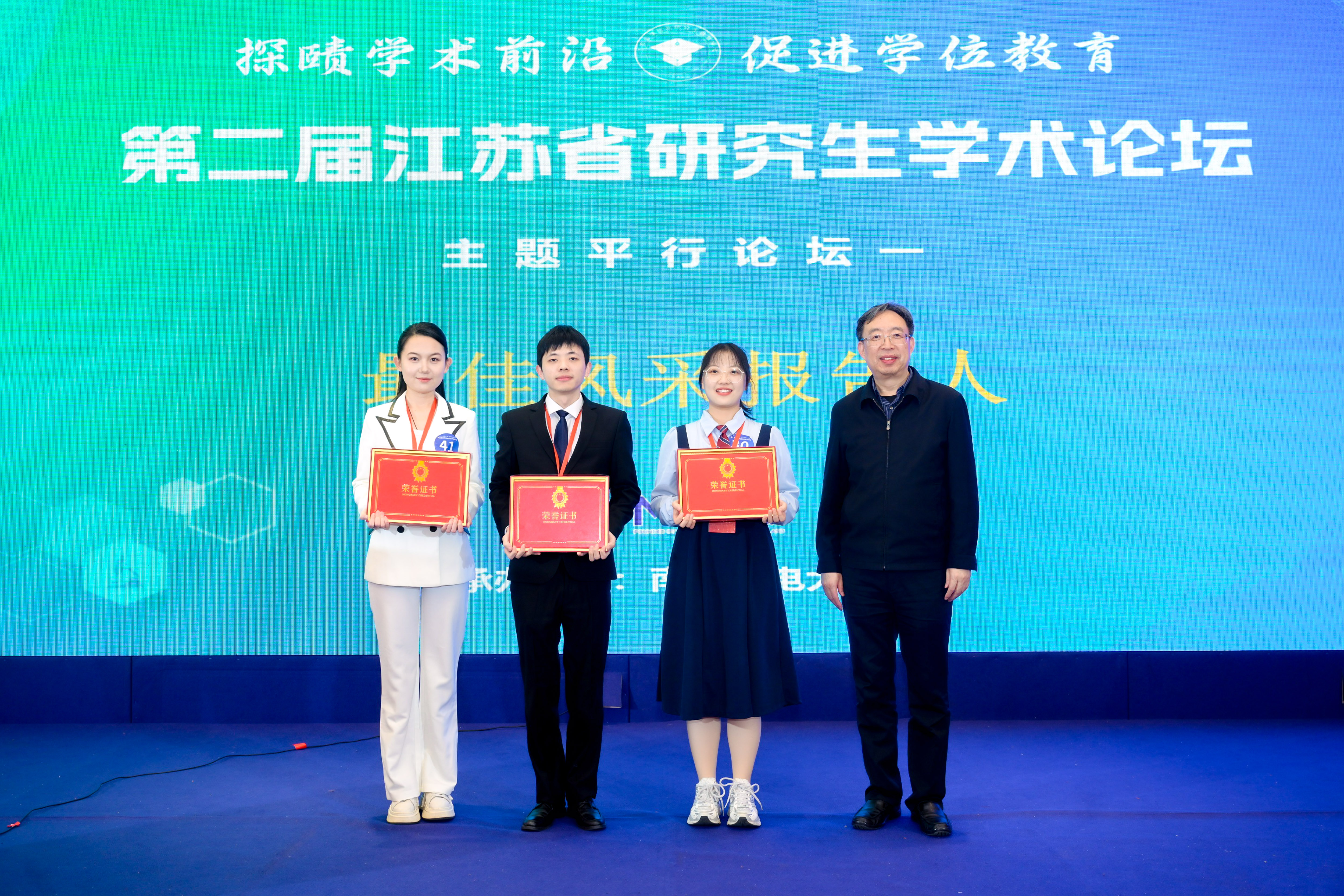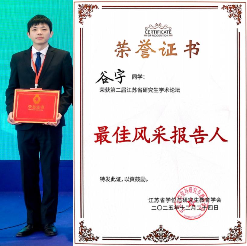 12月24日,第二届江苏省研究生学术论坛在南京成功举办。本届论坛在江苏省教育厅的指导下,由江苏省学位与研究生教育学会主办、南京邮电大学承办,引进了国际学术界通用的“三分钟论文演讲”(3MT)展示模式,强调在极短时间内清晰、生动地阐述科研工作的价值与发现,突出跨学科融合、科研普及与表达能力并重的指导思想。本届论坛由江苏省教育厅原厅长葛道凯、南京邮电大学副校长谢平等多位资深专家担任评委,污漫 谷宇同学代表学校参加论坛并获评“最佳风采报告人”和“优秀学术报告”奖,江苏省教育厅原厅长葛道凯为谷宇同学颁发奖项。