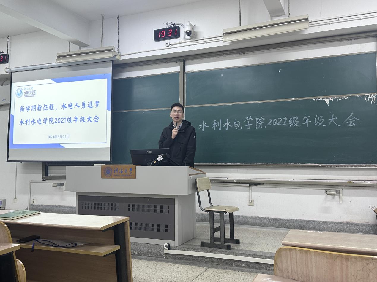 To help third year students fully understand the importance of career development, grasp the critical period, demonstrate a good academic atmosphere, and establish a correct view of career selection and employment. On March 21st, our college's 2021 undergraduate students held a grade conference with the theme of New Semester, New Journey, Water and Electricity, Brave Pursuit of Dreams. Class mentors Shen Lei and Zhan Lucheng were invited to attend, and all 2021 undergraduate students attended the conference. Counselor Hou Kaizhi presided over the conference.
