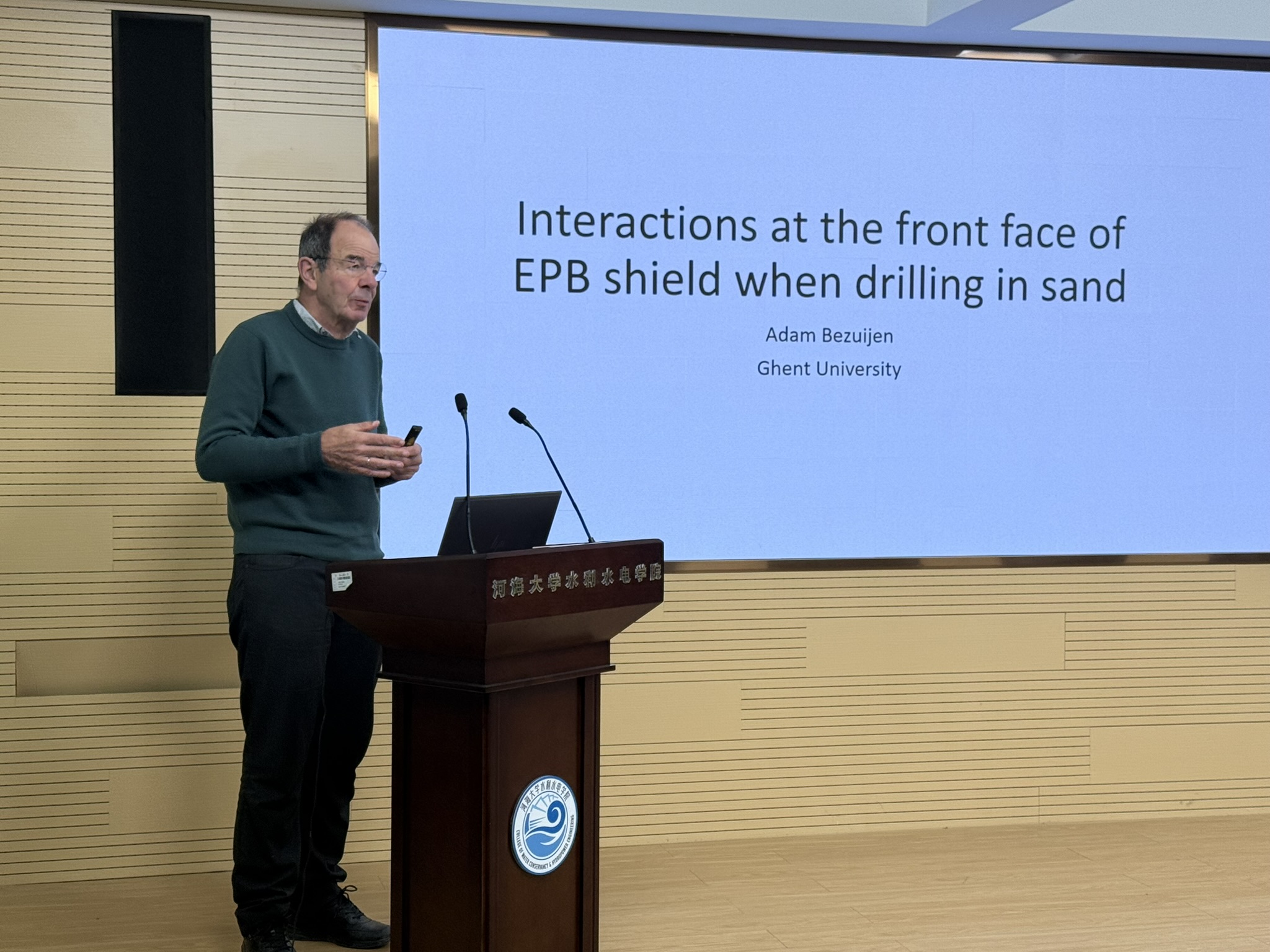 On the morning of November 19, 2025, the college successfully held an academic symposium in the 301 conference room of the Water and Electricity Building. At the invitation of Professor Wang Yuan, Professor Adam Bezuijen from Ghent University in Belgium visited our university and delivered an academic report titled Interaction Mechanism Between Shield Tunneling Face and Sandy Ground Layers. This report aims to deepen the understanding of shield tunneling mechanisms in complex sandy ground layers, reveal the interaction mechanism among soil-shield-groundwater-foam, and provide scientific evidence and technical support for refined control of shield tunneling faces and construction safety risk prevention.